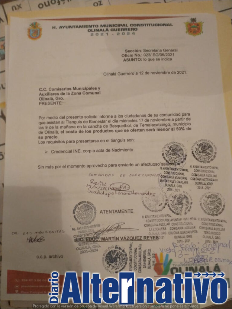 El oficio fue girado a los comisarios municipales y auxiliares de la zona comunal de Olinalá, mediante el cual solicitaban que se informara a los ciudadanos de la comunidad para que asistieran al Tianguis del Bienestar este miércoles a partir de las 9 de la mañana, en la cancha de basquetbol de la comunidad.