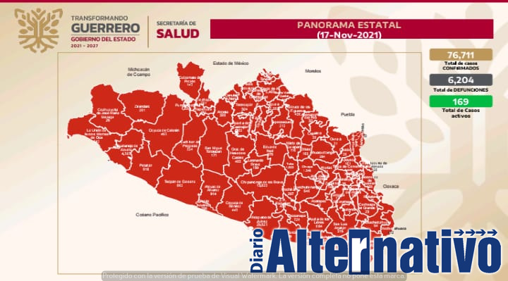 En cuanto a los casos activos, se informó que al día de hoy hay 169 casos, 44 de los cuales están concentrados en Acapulco, 24 en Iguala, 22 en Taxco, 18 en Chilpancingo, nueve en Zihuatanejo, seis en Tlapa, cuatro en Chilapa, cuatro en Cocula, cuatro e Coyuca de Catalán y cuatro en Teloloapan.