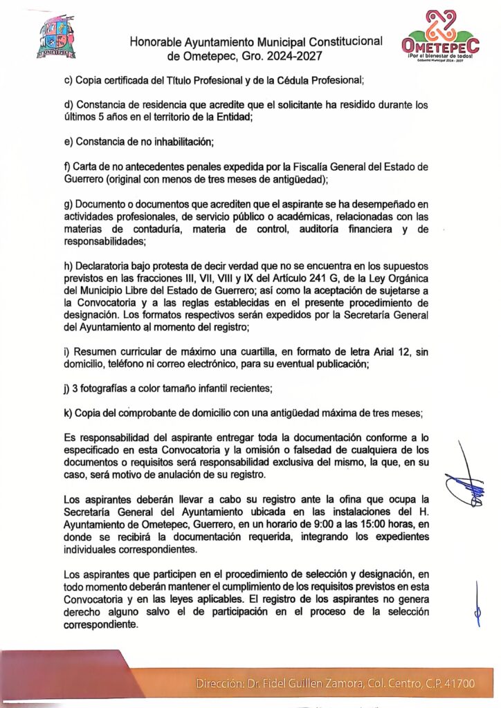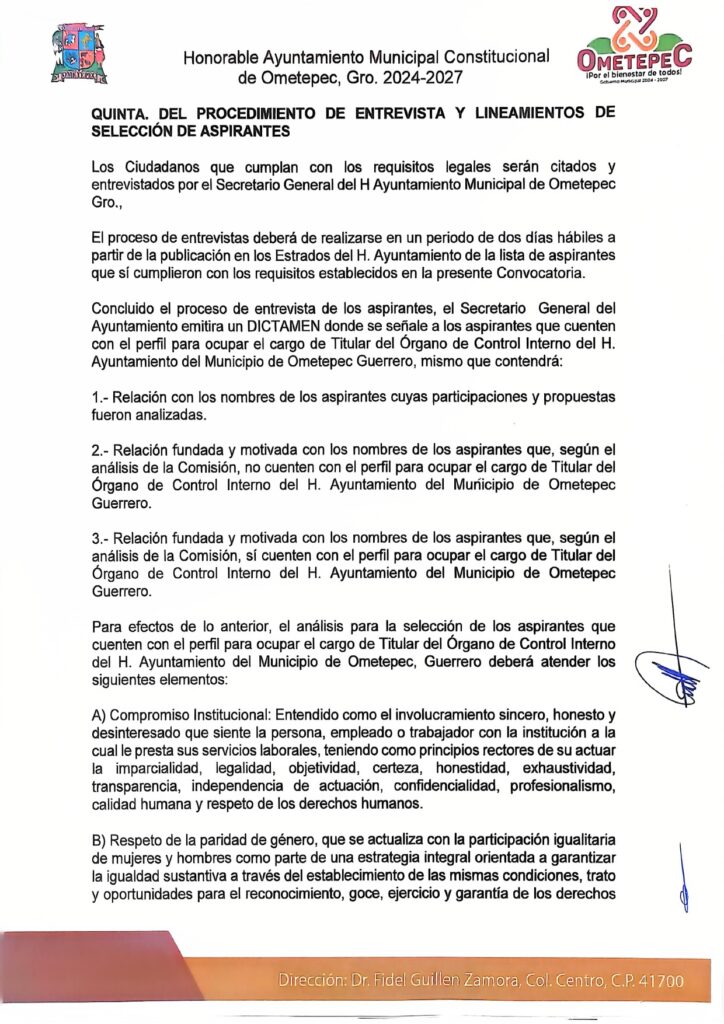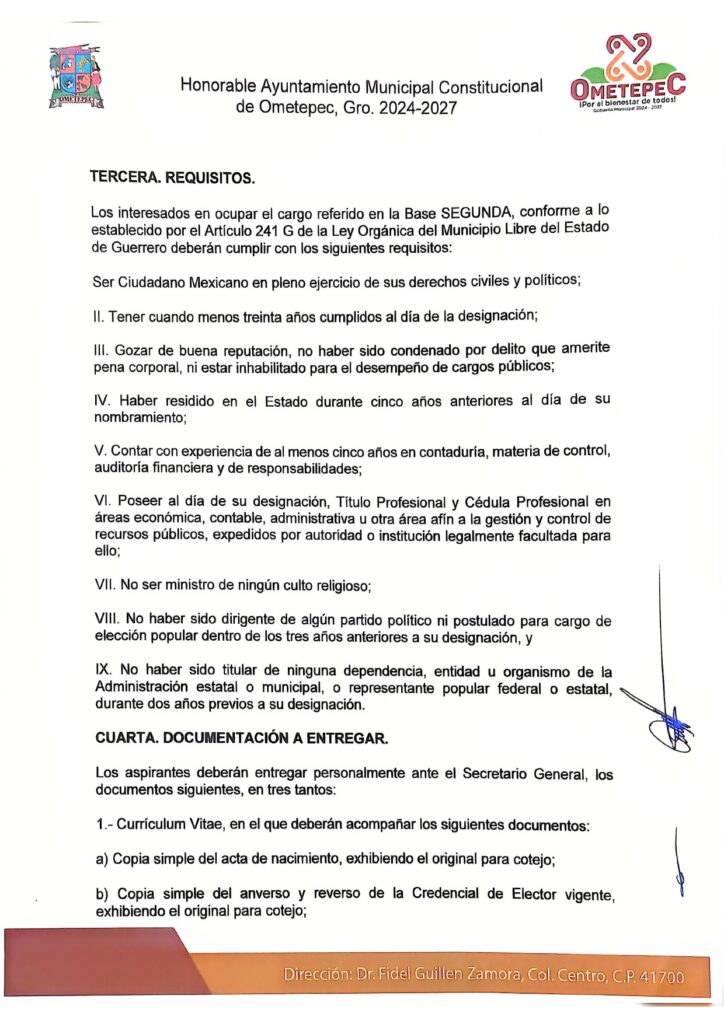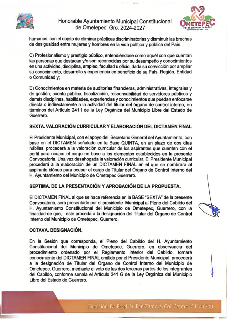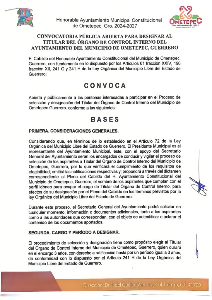 El Gobierno municipal de Ometepec emite la convocatoria abierta y pública para las personas interesadas en participar en el proceso de selección y designación del Titular del Órgano de Control Interno del municipio.