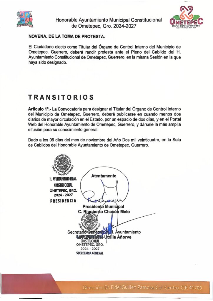 Gobierno de Ometepec emite convocatoria para designar al titular del Órgano de Control Interno del Ayuntamiento.